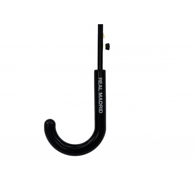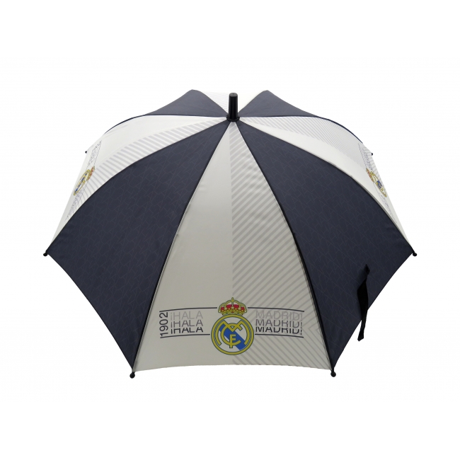 CARACTERÍSTICAS: Práctico paraguas de poliester con los colores y elementos del Real Madrid. Con asa de gancho y 96 cm de diámetro, es ideal para no mojarte los días de lluvia mientras luces el escudo de tu equipo. Gracias a su mecanismo automático, podrás abrirlo y cerrarlo fácilmente.