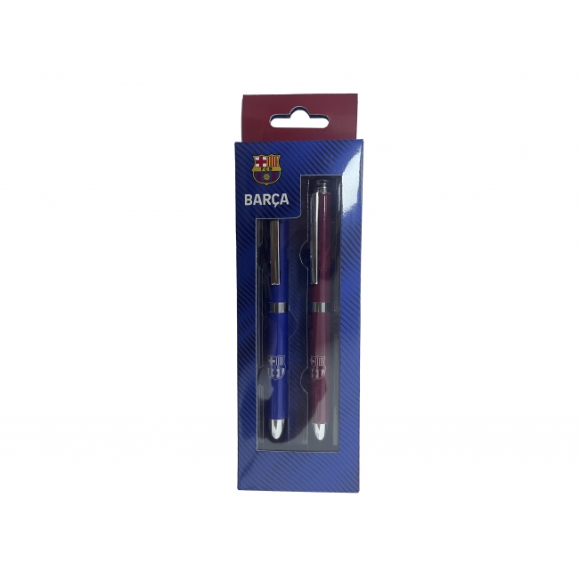 CARACTERÍSTICAS: Set de dos elegantes boligrafos de metal, uno en color azul y otro en granate, con el escudo culé. Presentado en una bonita caja con el escudo. Perfecto para regalar a niños y adultos.
