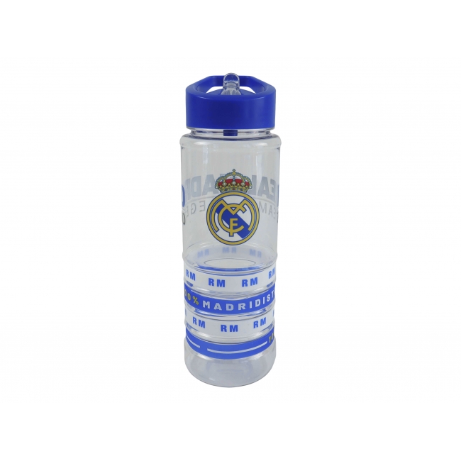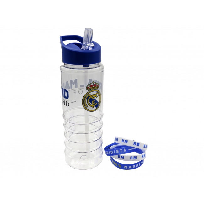 CARACTERÍSTICAS: Original botella de plástico diseñada con el escudo y los colores del Real Madrid, con capacidad de 700ml para que cumplas con tu hidratación diaria. Cuenta con 4 pulseras de silicona de diferentes diseños. Con boquilla de fácil apertura y tapón a rosca de gran anchura, así como asa para que puedas llevarla cómodamente a cualquier lado.