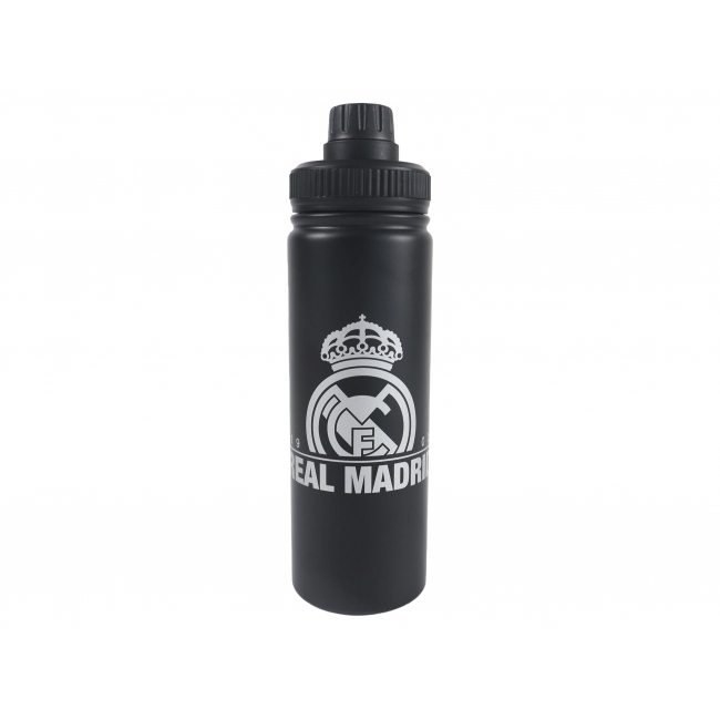 CARACTERÍSTICAS:Botella con el escudo del Real Madrid. Fabricada en acero inoxidable de la más alta calidad y resistente al óxido, sin BPA ni ftalatos. Mantiene el sabor y la pureza. Con boquilla para su fácil uso y tapón a rosca de gran anchura.
