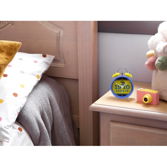 Reloj y despertador musical con los colores y el escudo del Cádiz CF, para que te despiertes de la mano de tu equipo de fútbol favorito.