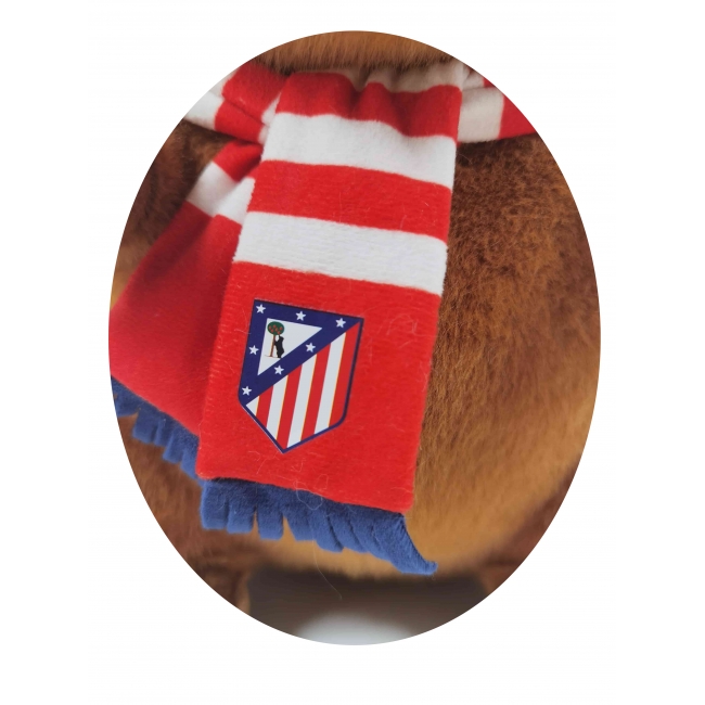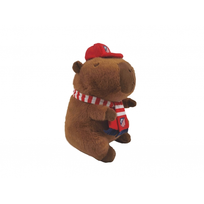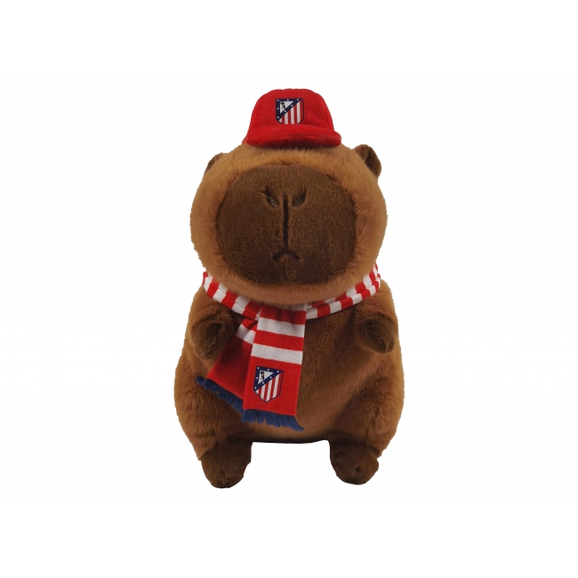 CARACTERÍSTICAS: Bonita capibara de peluche de 35 cm de alto equipada con gorra y bufanda con los colores y el escudo del Atleti. ¡La capibara más colchonera!