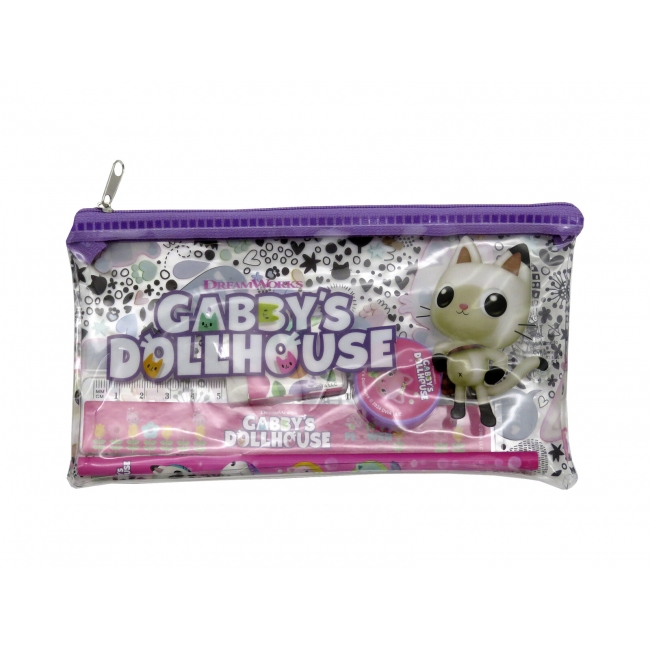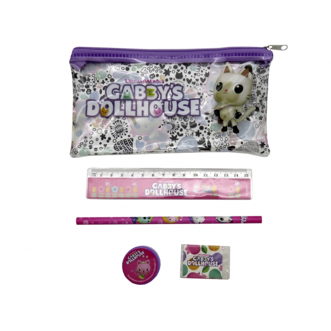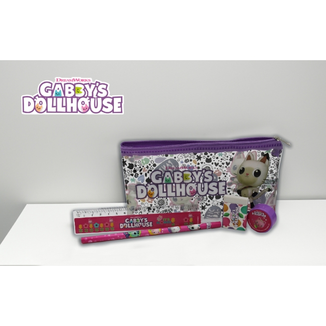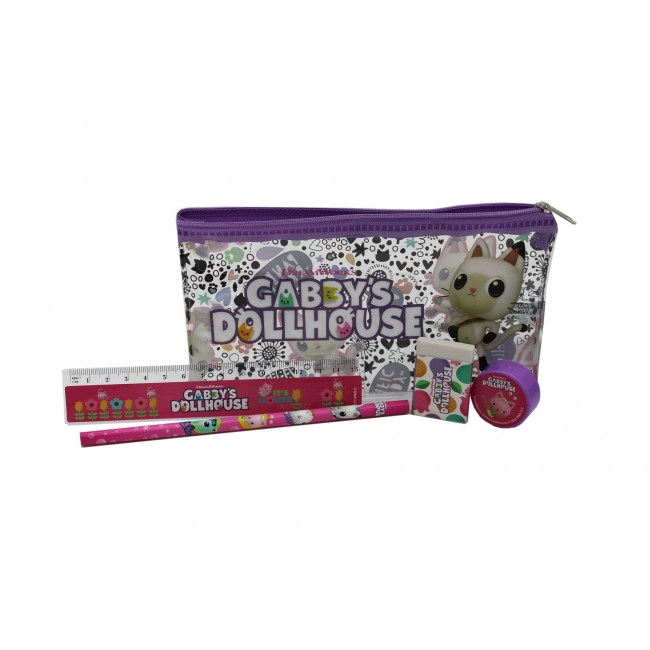 CARACTERÍSTICAS: Los diferentes artículos de este set están decorados con los elementos más icónicos de la serie Gabby´s Dollhouse. Contiene un portatodo, una regla, una goma, un sacapuntas y un lápiz.