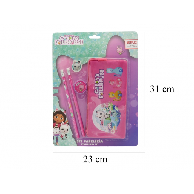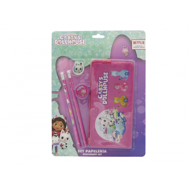 CARACTERÍSTICAS: Los diferentes artículos de este set están decorados con los elementos más icónicos de la serie Gabby´s Dollhouse. Contiene estuche, dos lápices, una goma y un sacapuntas.